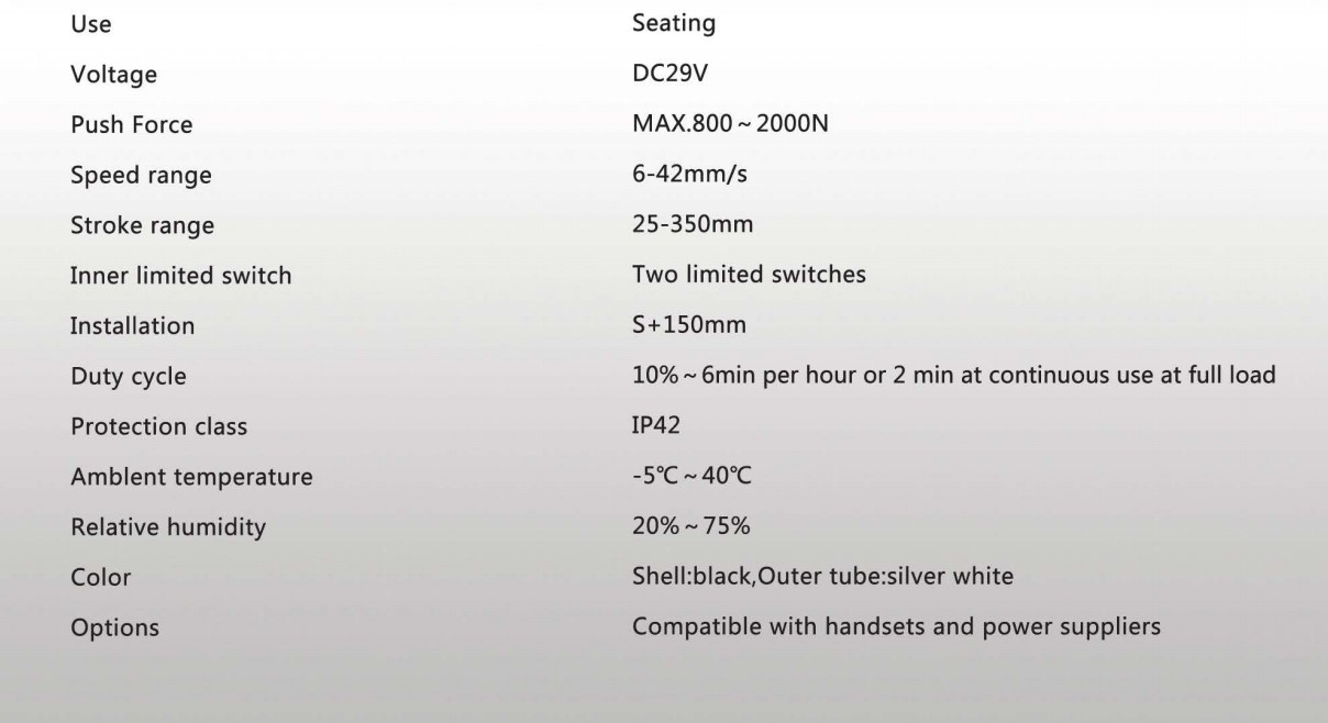 外觀新穎、制作精良、噪音小、操作簡單,成為國內外暢銷產品,廣泛應用于電動沙發、醫療床、手術床、按摩椅等。
